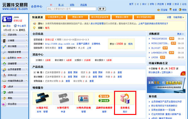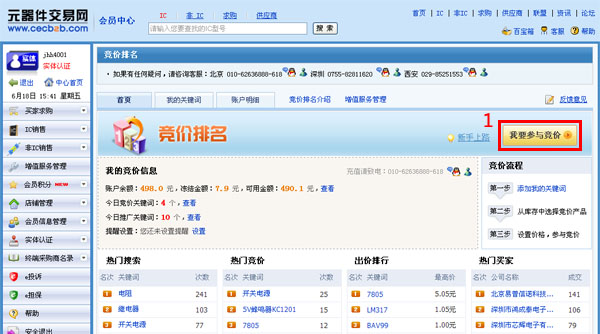1、開通服務(wù)后,登錄會(huì)員中心,點(diǎn)擊首頁增值服務(wù)“競價(jià)”(或左側(cè)菜單“增值服務(wù)管理”,點(diǎn)擊“我要競價(jià)”)進(jìn)入競價(jià)排名首頁。