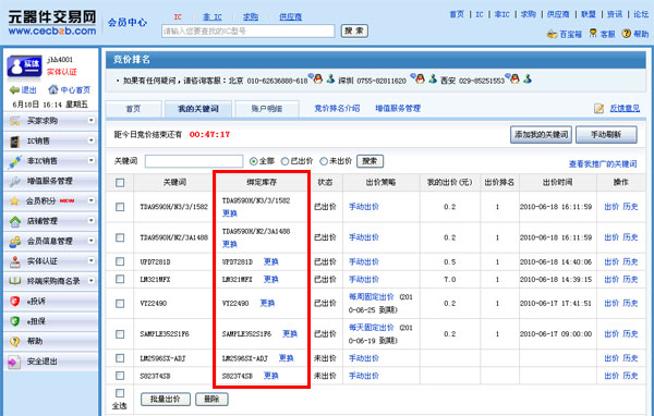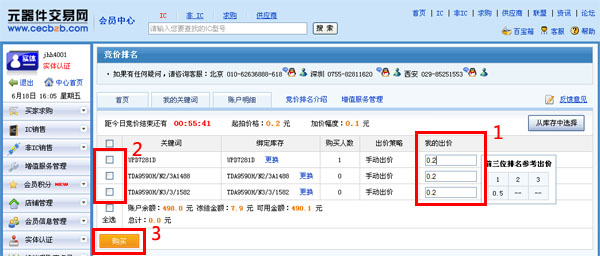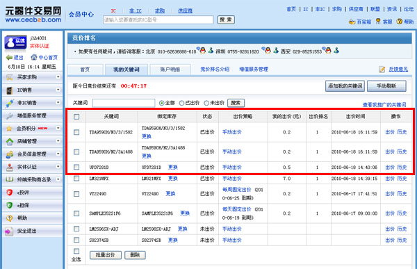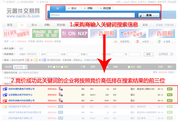 競價(jià)排名是元器件交易網(wǎng)為通過實(shí)體認(rèn)證的會(huì)員全新打造的一款搜索結(jié)果排名服務(wù)。當(dāng)用戶搜索某產(chǎn)品關(guān)鍵詞時(shí),競價(jià)成功此關(guān)鍵詞的企業(yè)將按照出價(jià)高低排在搜索結(jié)果的前三位。