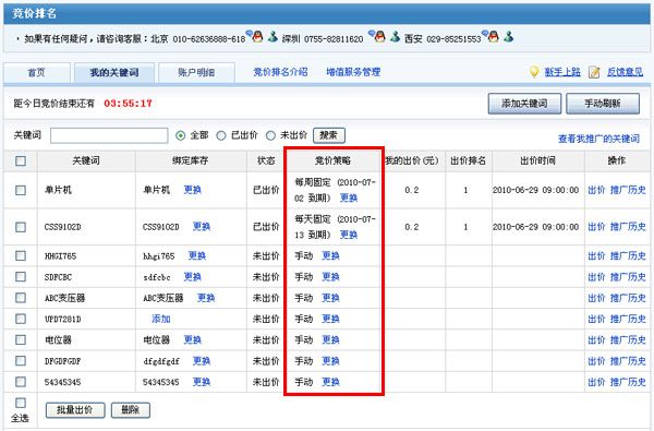 您在“我的關(guān)鍵詞頁”及“出價(jià)頁”都可以操作,以出價(jià)頁為例: